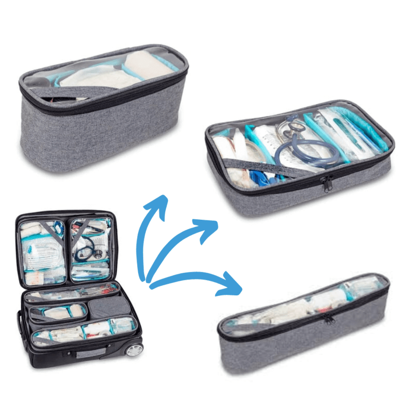 Dispone de 5 neceseres extraíbles con ventana transparente y un neceser térmico para medicinas que necesitan mantener su temperatura estable en el transporte. Interior modulable con sistema de velcro y ganchos.